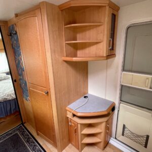 Vaunun etuosassa muhkea saarekevuode, takana viihtyisä U- ryhmä jonka ympärille mahtuu isompikin porukka maailmaa parantamaan.