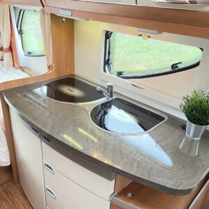 Edessä parivuode. Keskellä keittiö sekä wc-tila. Takana tilava u-pöytäryhmä.