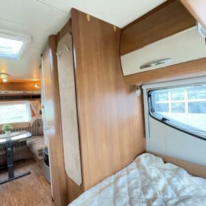 Edessä parivuode. Keskellä keittiö sekä wc-tila. Takana tilava u-pöytäryhmä.