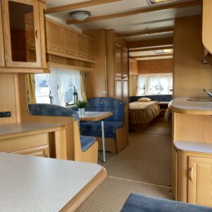 Pohjaratkaisussa edessä erillisvuoteet. Tilava keittiö kaasu- uunilla. Keskiosassa aamupalaryhmä johon saa tehtyä lisävuoteen ja keittiö. Takaosassa reilunkokoinen U- ryhmä, mihin saa pedattua parivuoteen.