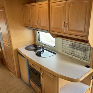 Jääkaappi, Kaasu-uuni, Liesi, TV-antenni tai lautasantenni, Alde, Lattialämmitys sähkö, Sähköpatruuna, Lattiamatot asunto-osassa, Kattoluukku, Nestekiertolämmitys, Pakastelokero, Tukijalat, Erillisvuoteet, Kasetti WC, Kasettiverhot