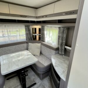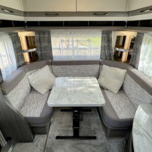 Vaunun takaosasta löytyy viihtyisä ja valoisa U- ryhmä joka on sijattavissa parivuoteeksi.