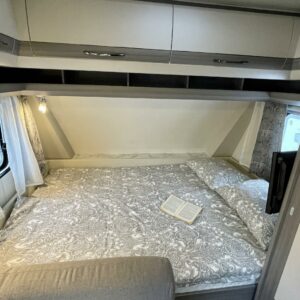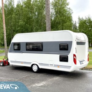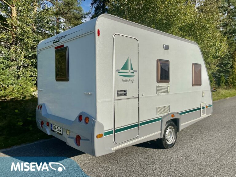 Todellinen tilaihme! Tähän näppärästi perässä kulkevaan matkakotiin mahtuu majoittumaan jopa seisemän henkilöä. Edessä on poikittainen parivuode minkä alle jää runsaasti säilytystilaa. Säilytystilan käyttöä päästään hyödyntämään myös ulkopuolelta luukun kautta. Keskelle vaunua on sijoitettu vastakkain istuttava pöytäryhmä mistä saadaan sijattua vuode kahdelle henkilölle. Toisella puolella on keittiö varusteltuna normaalilla matkailuvaunun keittiövarustuksella. Takaosaa hallitsee poikittain sijoitettu 3-kerrosvuode, sekä WC/kylpyhuonetilat. Iso kattoluukku antaa mukavasti luonnonvaloa sisätiloihin. Lämmityksenä Trumatic ilmakeskuslämmitys. Juuri katsastettu ja tarkastettu vaunu valmiina retkiin.