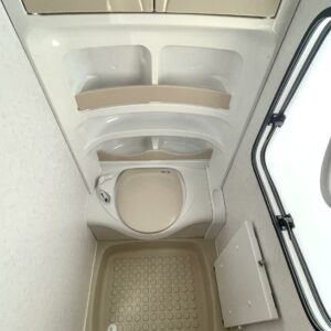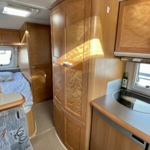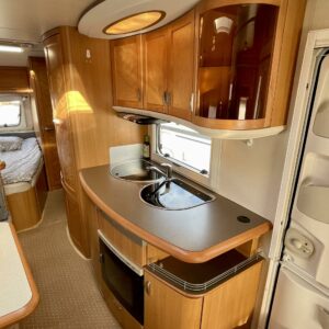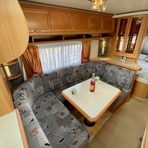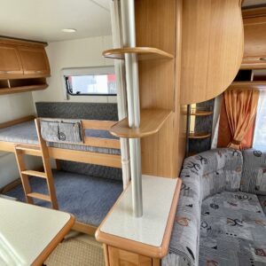 Vaunun takaosassa kerrosvuoteet ja L- pöytäyhmä. Vaunun keskivaiheilta löytyy iso U- pöytäryhmä ja keittiö kaasu- uunilla varustettuna. Vaunun etuosassa on pitkittäinen parivuode ja pesuhuone/ WC. Molemmat pöytäryhmät sijattavissa tarpeen vaatiessa lisävuoteiksi.