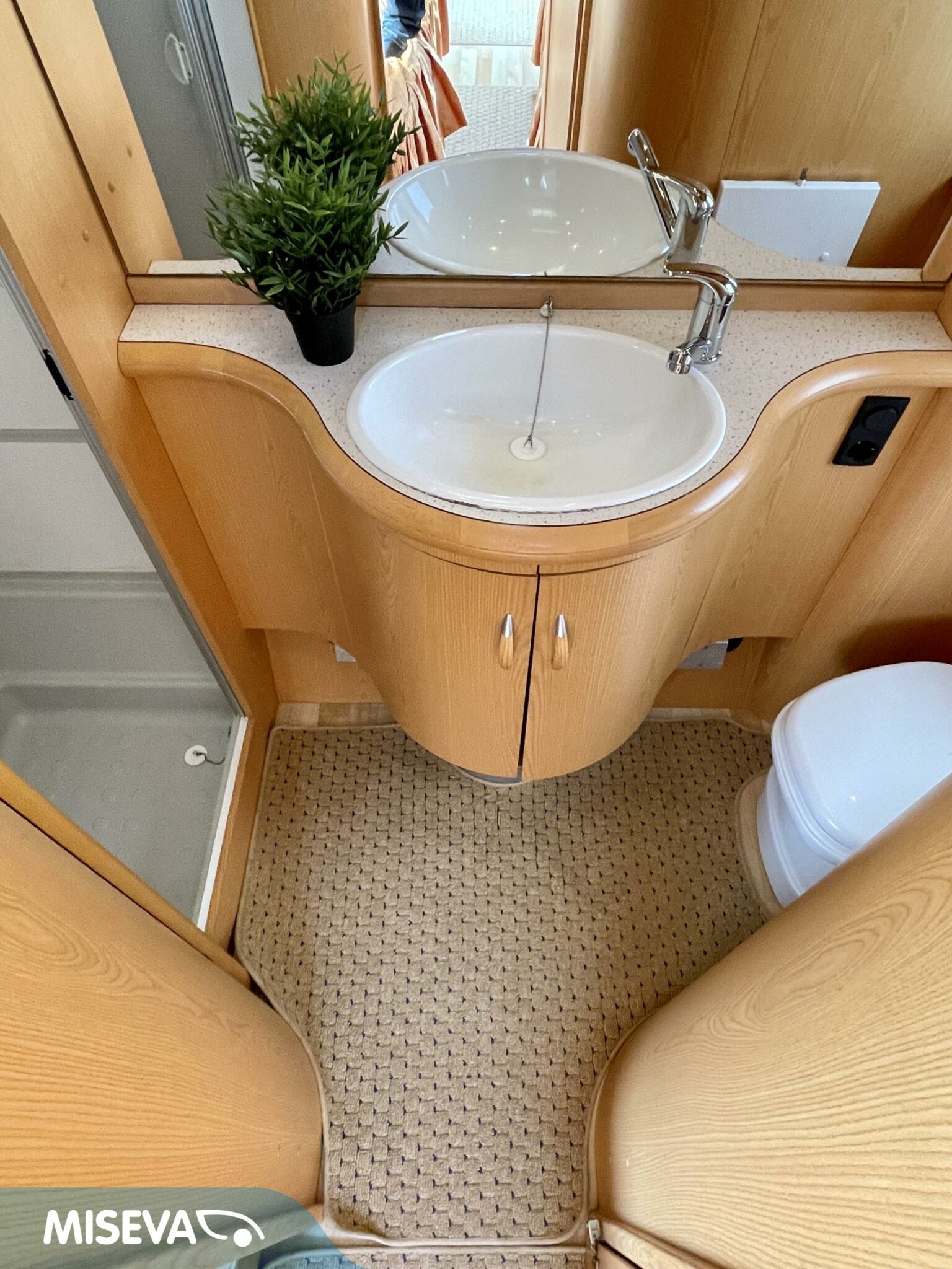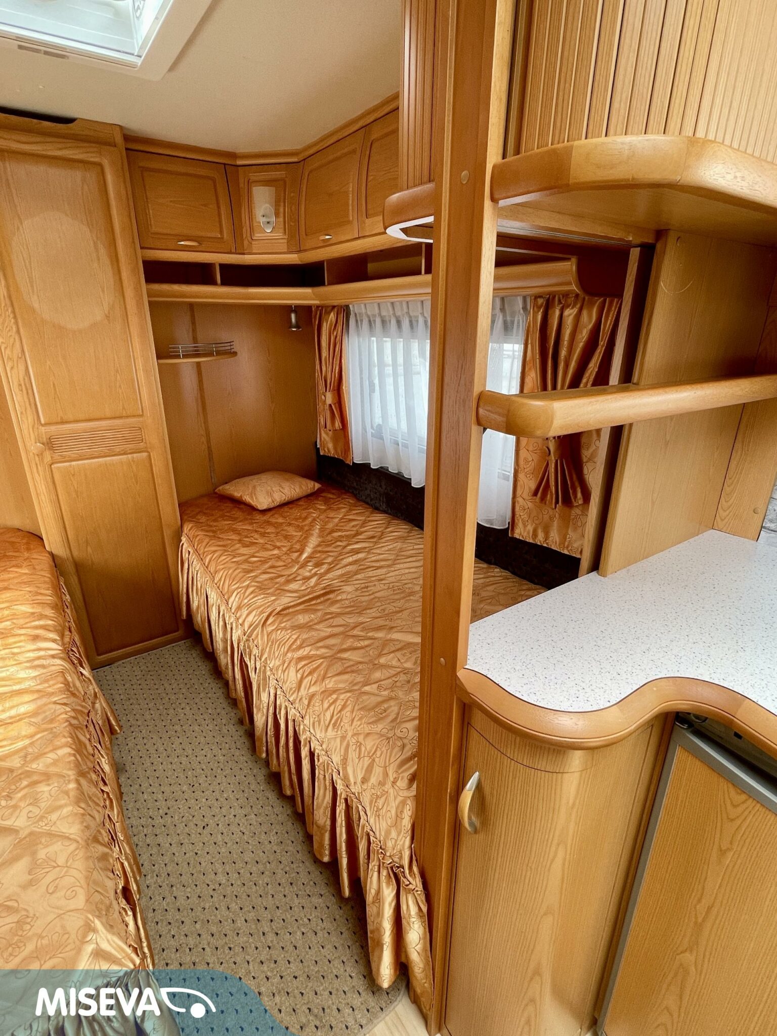 Takapäässä sijaitsee erillisvuoteet ja koko vaunun levyinen pesuhuone/ WC erillisellä suihkunurkkauksella.