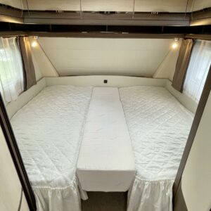 Tyylikkäästi suunnitellun vaunun pohjaratkaisussa takana iso vuoteeksi sijattava U-sohvaryhmä. Keskiosasta vaunua löytyy tilava keittiö reilunkokoisella jääkaapilla sekä WC-tila. Etuosassa mukavat erillisvuoteet jotka yhdistettävissä mahtavan kokoiseksi parivuoteeksi.
