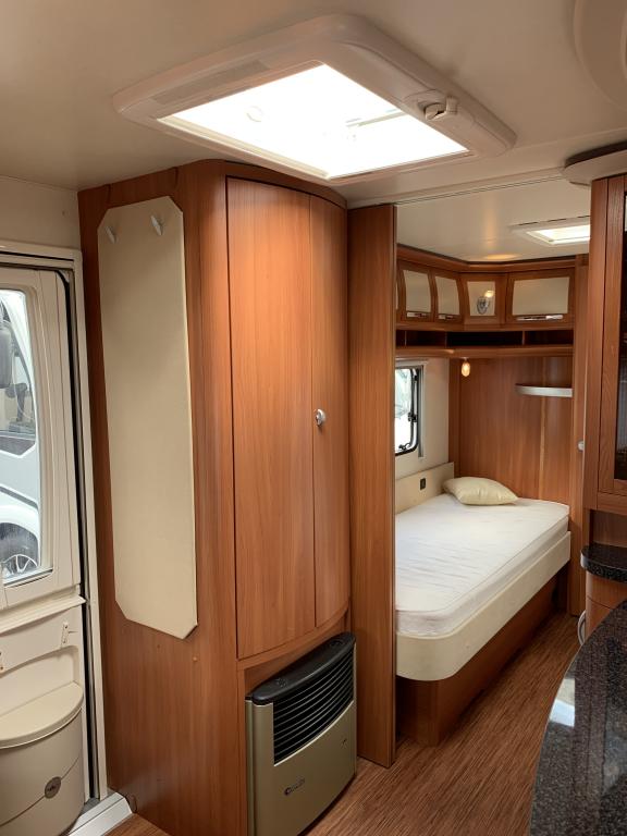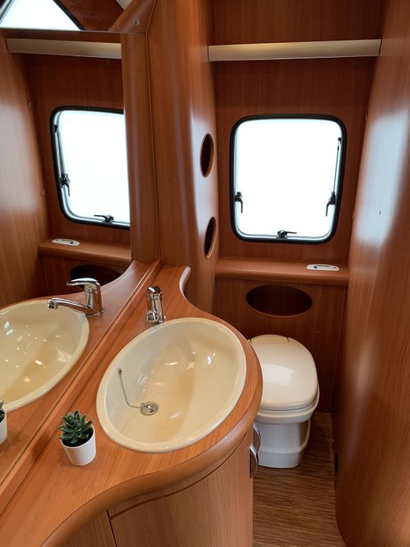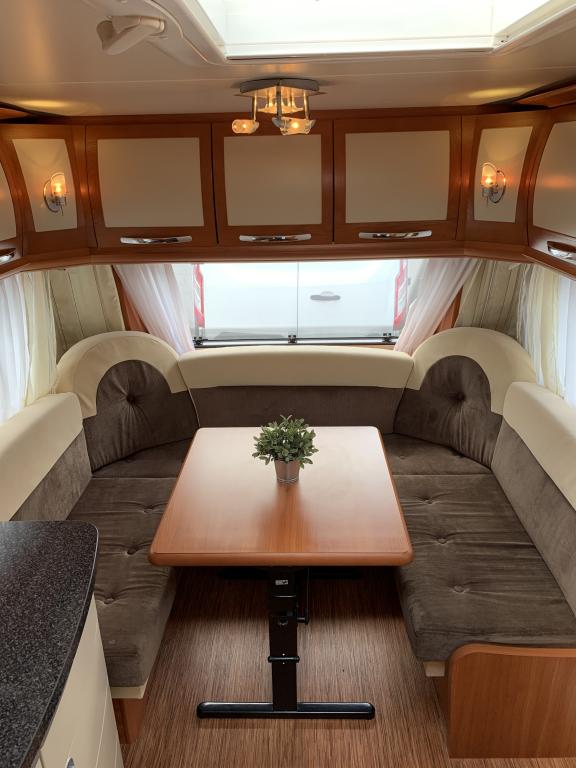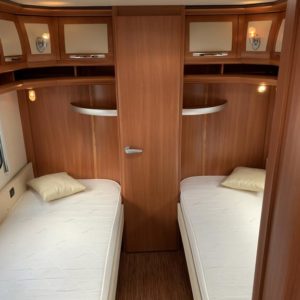 Takana hulppea pesuhuone, sitten erillisvuoteet joustinpatjoilta, keittiö, edessä U-istuinryhmä josta myös toinen parivuode. Varusteissa mm mover vaunun siirtojärjestelmä.