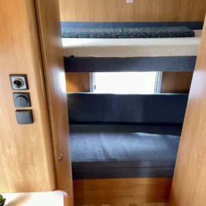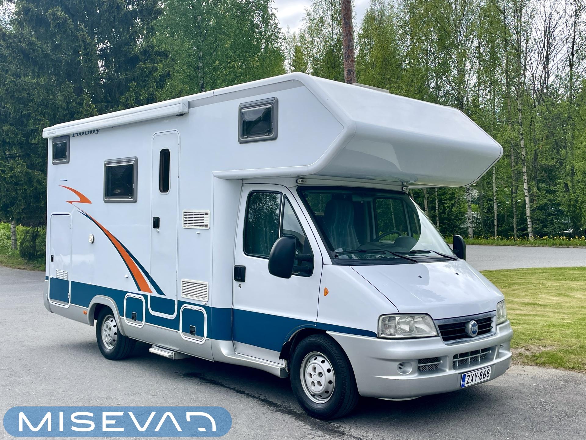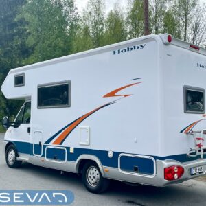 No nyt olisi Hobby tuplapohjalla, millä lähteä kiertämään maailmaa. Rekisteröity neljälle ja tässä ei tarvitse miettiä ruokapöydän muuttamista sängyksi, kun petipaikat löytyy valmiina. Sänkyjä löytyy edestä ja takaa. Takana kerrossänky ja edessä poikittainen leveä parisänky. Ruokailuryhmästä saa toki tarvittaessa vielä sen kolmannenkin. Keittiössä on runsaasti kaappeja ja kokkia ajatellen hyvin laskutilaa ruoanlaittoon. Isosta Wc:stä löytyy myös suihku peseytymistä varten. Säilytystilaa löytyy runsaasti kaksoispohja rakenteen ansiosta. Takatallin lisäksi sivulta löytyy lisää lokeroita säilytykseen. Voimaa maailmanvalloitus matkalle antaa Ducaton 2.8 litrainen diesel mylly.