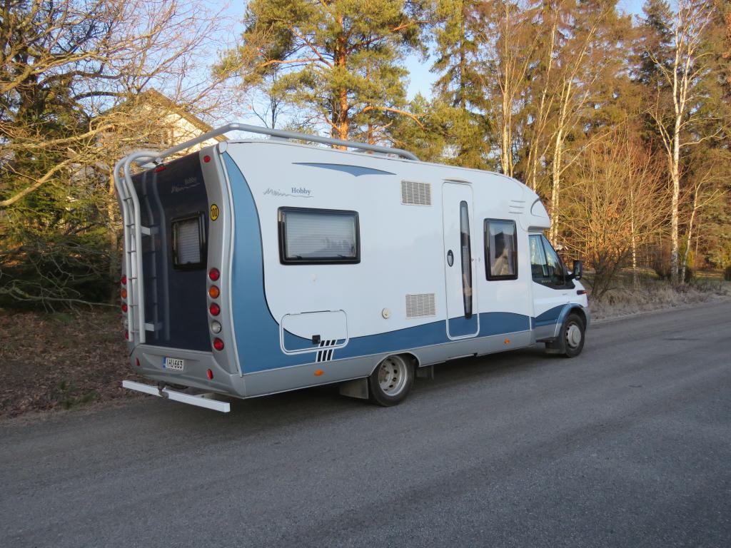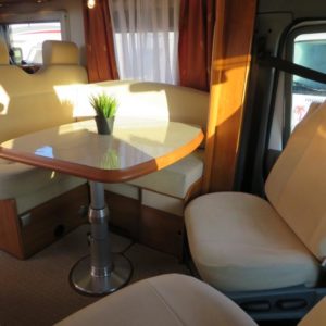 Auton takaosassa pitkittäinen parivuode ja tilava pesuhuone erillisellä suihkunurkkauksella, edessä valoisa pöytäryhmä sivusohvalla. Lisäksi L- keittiö isolla jääkaappipakastimella.