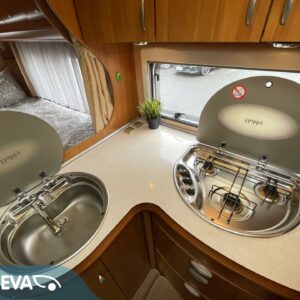 Auton takaosassa on pitkittäinen parivuode ja pesuhuone/ WC erillisellä suihkunurkkauksella. Etuosasta löytyy ison kattoluukun ansiosta valoisa pöytäryhmä, jonka ympärille mahtuu 5 henkeä ruokailemaan ja iltaa istumaan. Keskellä autoa sijaitsevan keittiön varustuksen kruunaa ison jääkaappi- pakastimen ja kaasu- uunin muodostama torni.