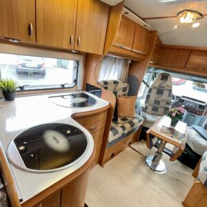 Auton takaosassa on pitkittäinen parivuode ja pesuhuone/ WC erillisellä suihkunurkkauksella. Etuosasta löytyy ison kattoluukun ansiosta valoisa pöytäryhmä, jonka ympärille mahtuu 5 henkeä ruokailemaan ja iltaa istumaan. Keskellä autoa sijaitsevan keittiön varustuksen kruunaa ison jääkaappi- pakastimen ja kaasu- uunin muodostama torni.