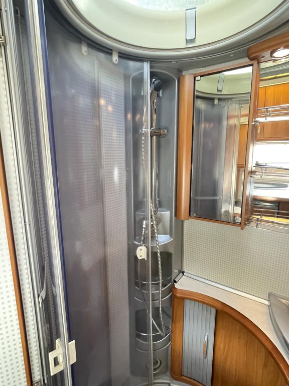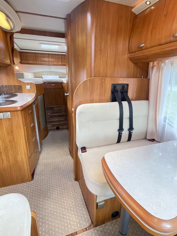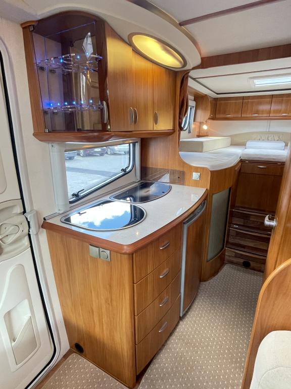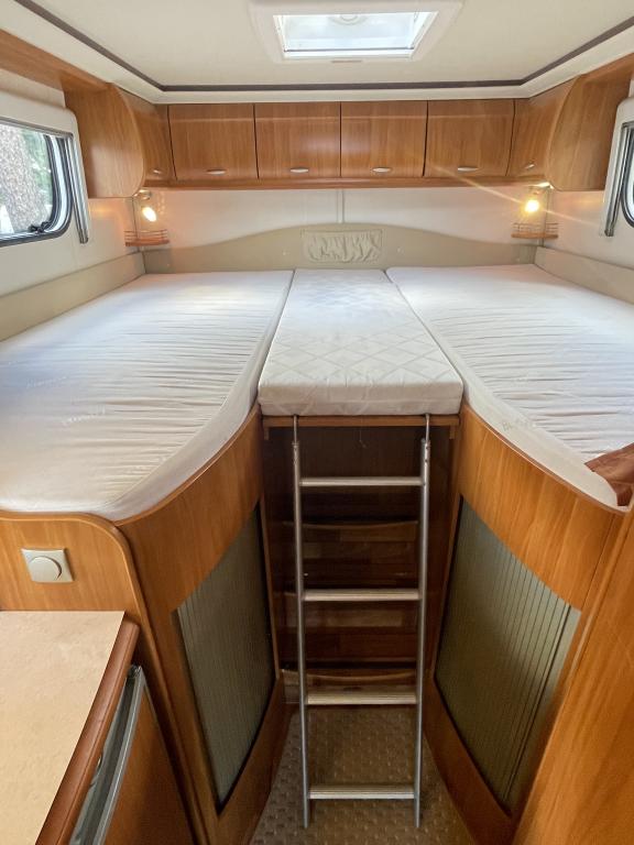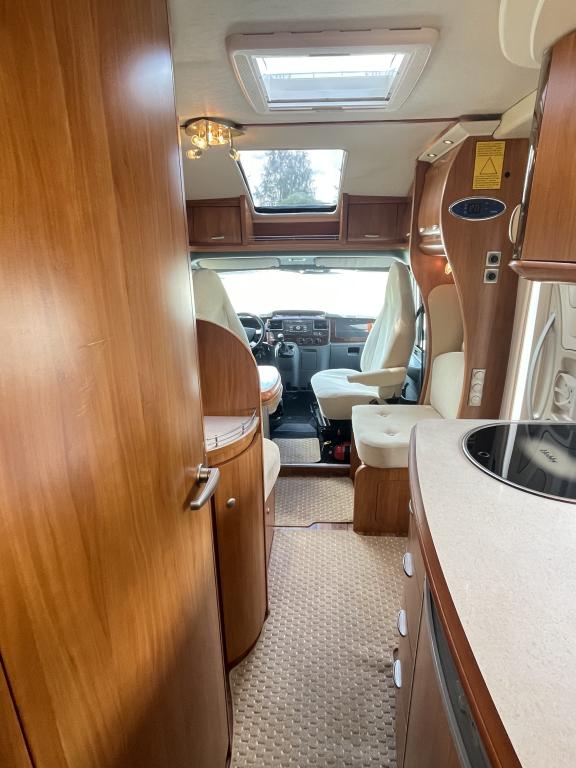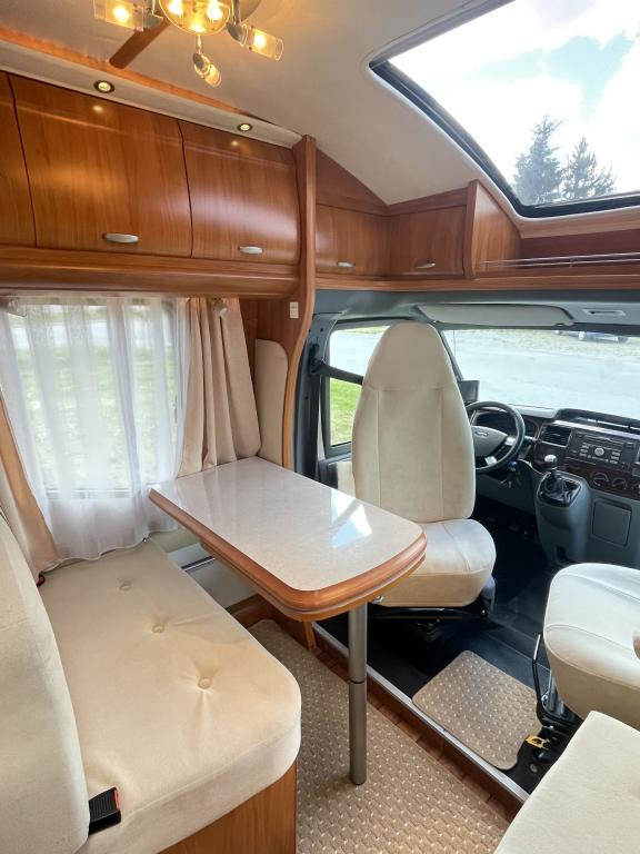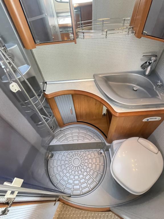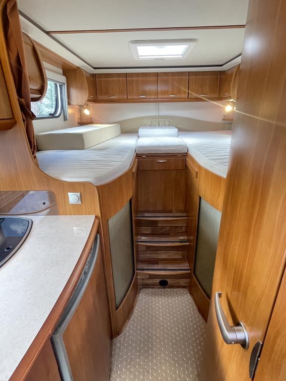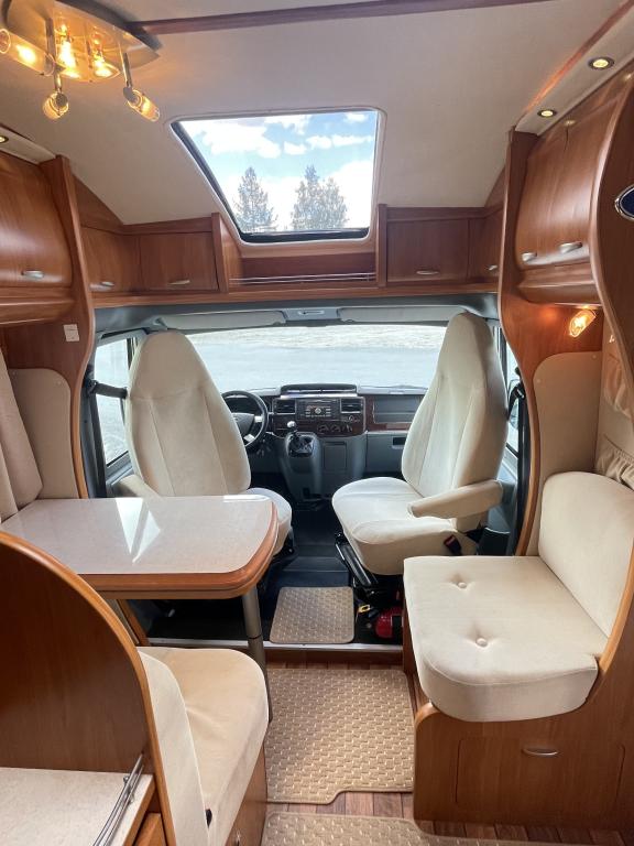 Siisti ja valoisa pohjaratkaisu jossa edessä sohvaryhmä, kääntyvät etuistuimet sekä suuri valoa ja tilantuntua tuova kattoikkuna. Keskiosassa keittiö jääkaappipakastin- yhdistelmällä sekä Wc & Suihkutila kattoikkunalla. Takaosassa erillisvuoteet jotka levitettävissä suureksi parivuoteeksi. Erillisvuoteisiin pääsy portailla ja parivuoteeksi sijatessa tikkailla.