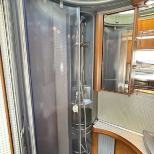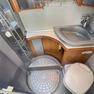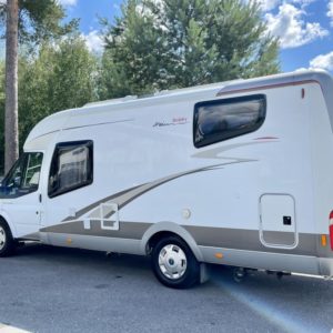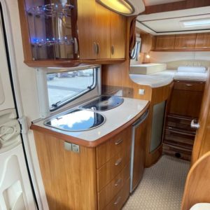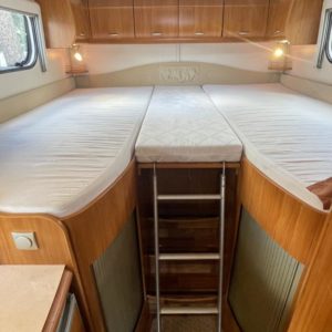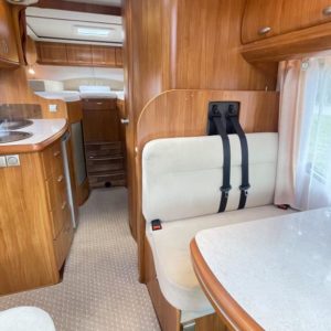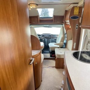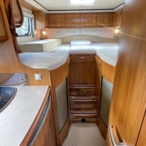 Siisti ja valoisa pohjaratkaisu jossa edessä sohvaryhmä, kääntyvät etuistuimet sekä suuri valoa ja tilantuntua tuova kattoikkuna. Keskiosassa keittiö jääkaappipakastin- yhdistelmällä sekä Wc & Suihkutila kattoikkunalla. Takaosassa erillisvuoteet jotka levitettävissä suureksi parivuoteeksi. Erillisvuoteisiin pääsy portailla ja parivuoteeksi sijatessa tikkailla.