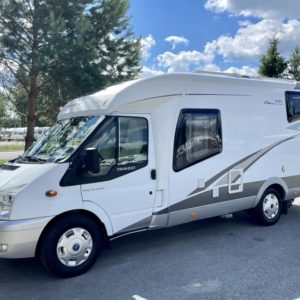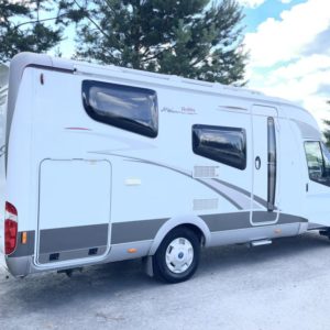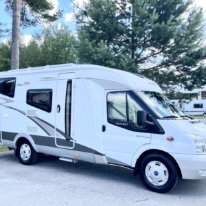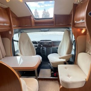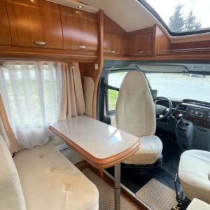 Siisti ja valoisa pohjaratkaisu jossa edessä sohvaryhmä, kääntyvät etuistuimet sekä suuri valoa ja tilantuntua tuova kattoikkuna. Keskiosassa keittiö jääkaappipakastin- yhdistelmällä sekä Wc & Suihkutila kattoikkunalla. Takaosassa erillisvuoteet jotka levitettävissä suureksi parivuoteeksi. Erillisvuoteisiin pääsy portailla ja parivuoteeksi sijatessa tikkailla.