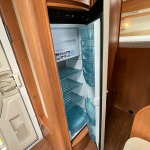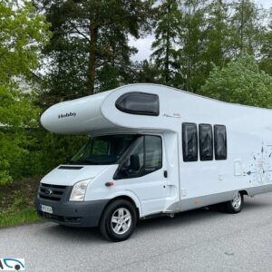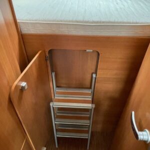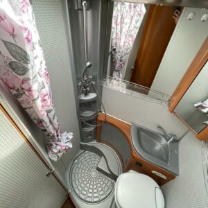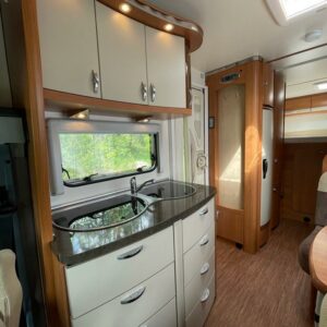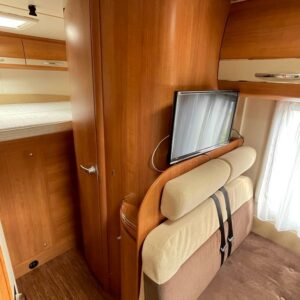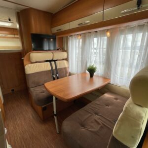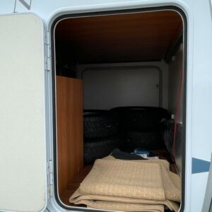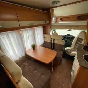 Takana parivuode ja alla mahtava tavaratila, keskellä pesuhuone ja keittiö, edessä istuinryhmä 4:lle, ohjaamon päällä tilava alkovivuode. Juuri katsastettu.