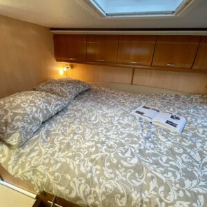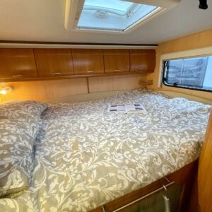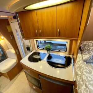 Poikittaisella parivuoteella ja takatallilla varustettu 6 metrinen matkakoti esimerkiksi pariskunnille.