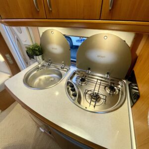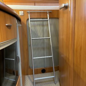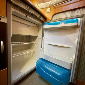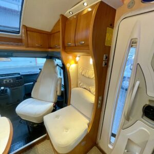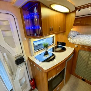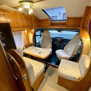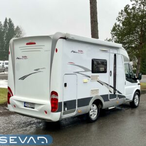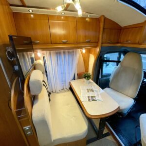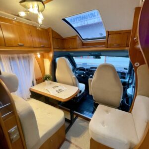 Auton takaosassa on poikittainen parivuode ja sen alle jää mukavasti säilytystiloja. Keskelle autoa asemoituu keittiötilat ja toiselta sivulta löytyy wc- ja kylpyhuonetilat. Edessä on pöytäryhmä minne yhdistyvät kääntyvät ohjaamon penkit. Lämmön pirttiin toimittaa Trumatic ilmapuhalluslämmitin. Autossa on tietysti myös normaalit matkailuajoneuvon varusteet, eli löytyy jääkaappi, lämminvesiboileri, sekä liesi. Ajettavissa henkilöauton B-kortilla ja rekisteröidyt matkustuspaikat neljälle henkilölle.