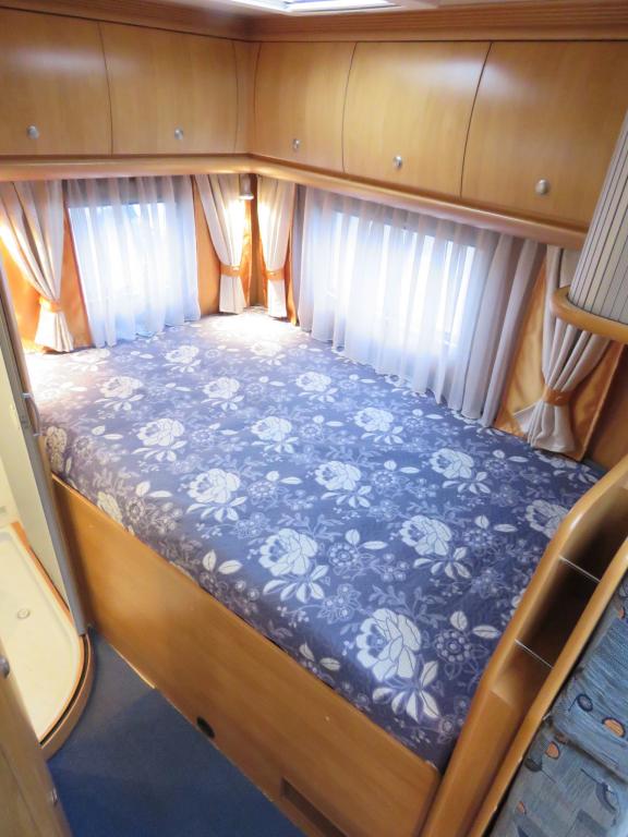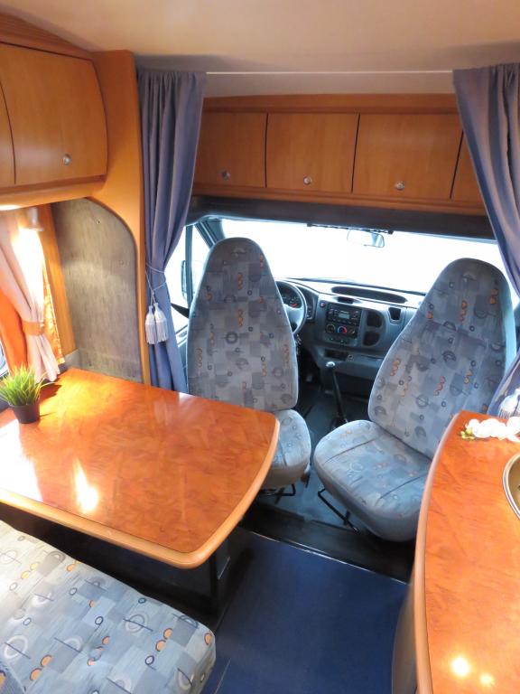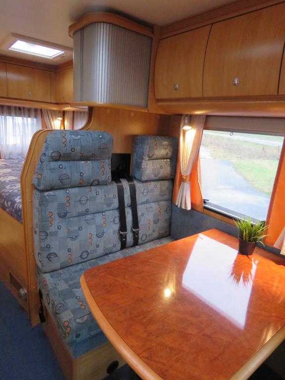 Auton takana vuode ja wc tilat, edessä istuinryhmä 4:lle sekä keittiö.