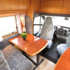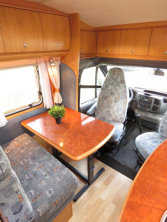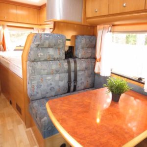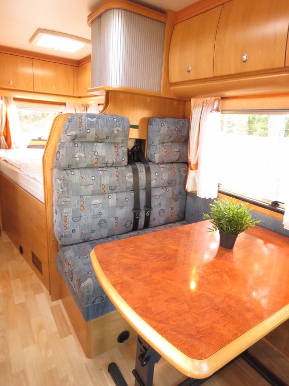 Auton takaosassa pitkittäinen parivuode ja pesuhuone, edessä valoisa pöytäryhmä neljälle.