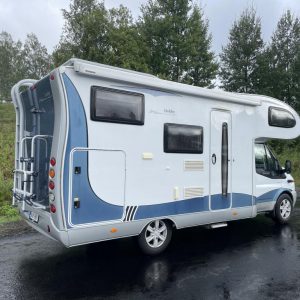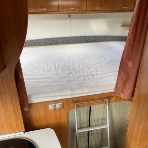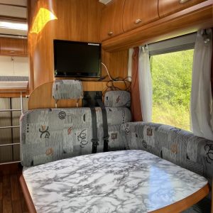 Auton takaosassa parivuode ja tilava takatalli molemminpuolisin luukuin. Edestä löytyy leveän alkovivuoteen lisäksi viihtyisä L- pöytäryhmä sivusohvalla.