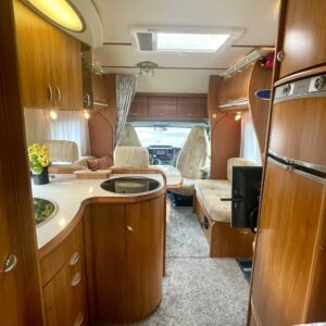Hobbyn tyyliä paripyöräisen voimanpesän, Transitin alustalla. Sisääntullessa sinua tervehtii Hobbyn tuttu lasivitriini. Tilassa on tyylikkyyden tuntua, vaikka kilometrjä onkin jo alla. Takaa löytyy parisänky, sekä tilava wc suihkulla. L-keittiö auton keskellä luo mukavasti karavaanari kokille tilaa touhuilla. Ruokailupöydän äärelle mahtuu helposti neljen hengen joukkue syömään. Ja kokonaisuuden saa muunnettua vielä sängyksi. Takana olevat paripyörät tekevät tämän auton erityisen vakaaksi ajettavaksi. Eikä parkissakaan turhia keinu. Tule tutustumaan ja koeajamaan Misevalle!