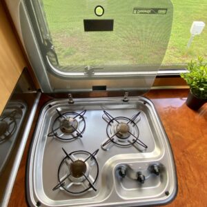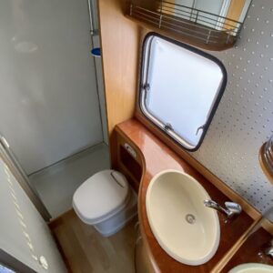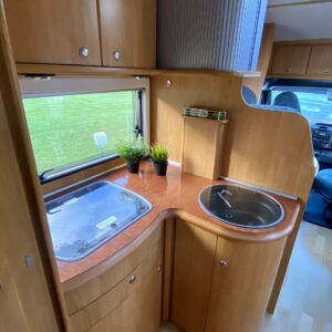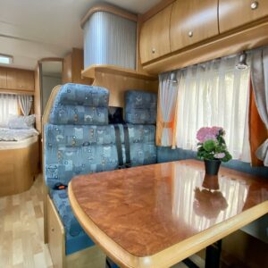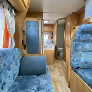 Pohjaratkaisussa asunto-osan etuosassa iso sohvaryhmä kääntyvillä ohjaamon penkeillä. Sohvaryhmästä saa myös tarpeen tullen sijattua lisävuoteen. Keskiosassa L-muotoinen keittiö isolla jääkaapilla ja pakastimella. Takaosassa pitkittäinen parivuode sekä hyvänkokoinen WC ja suihkutila.