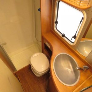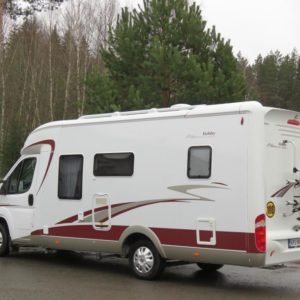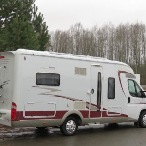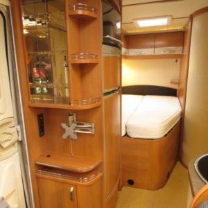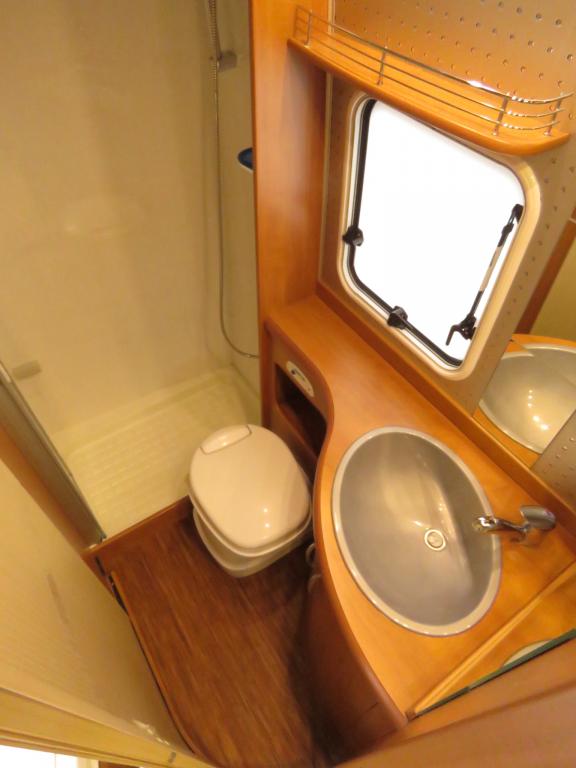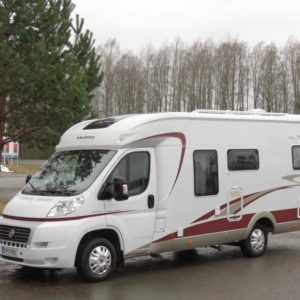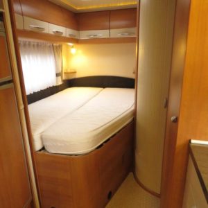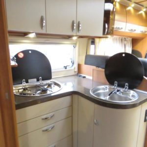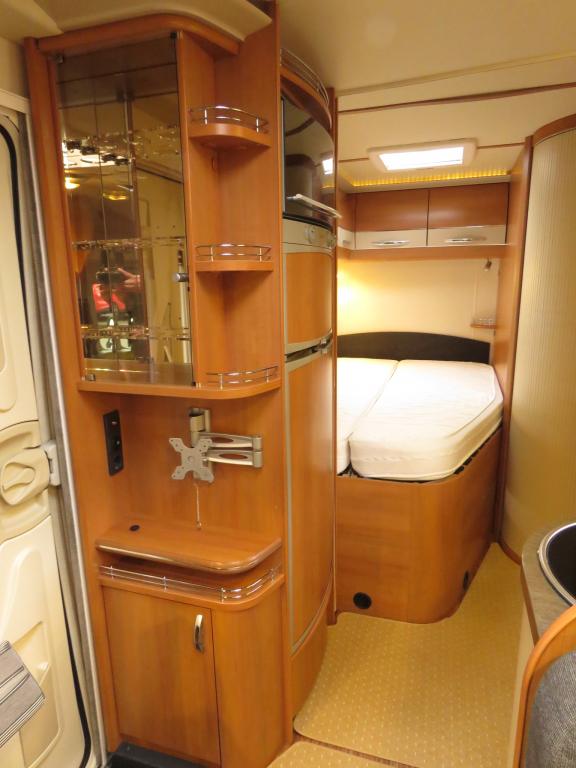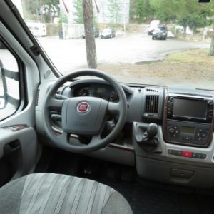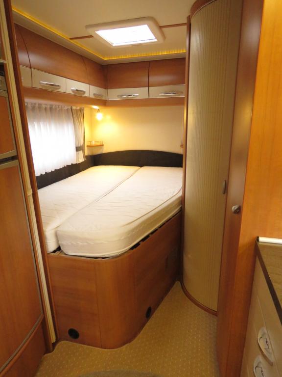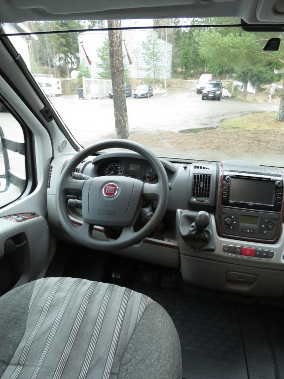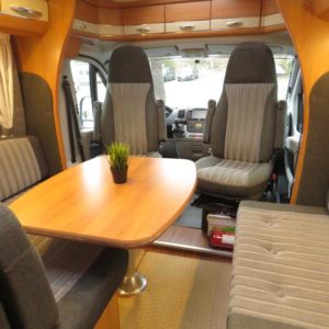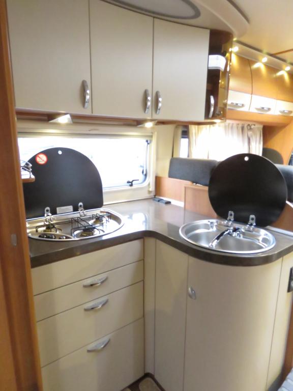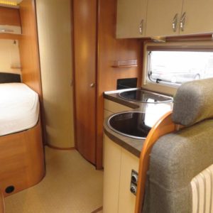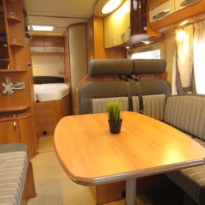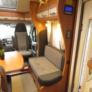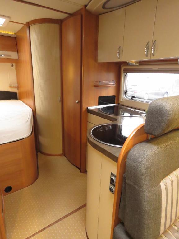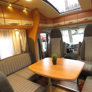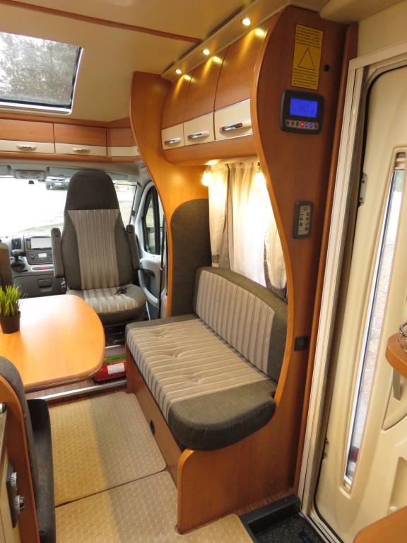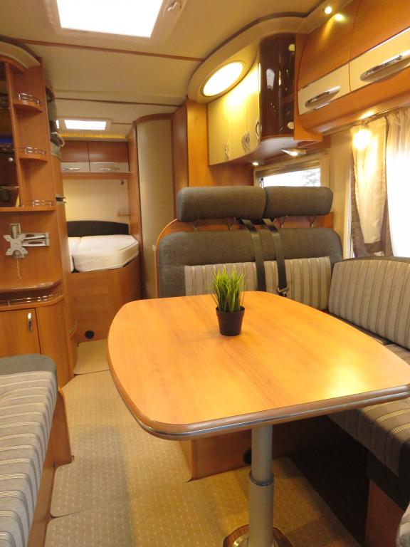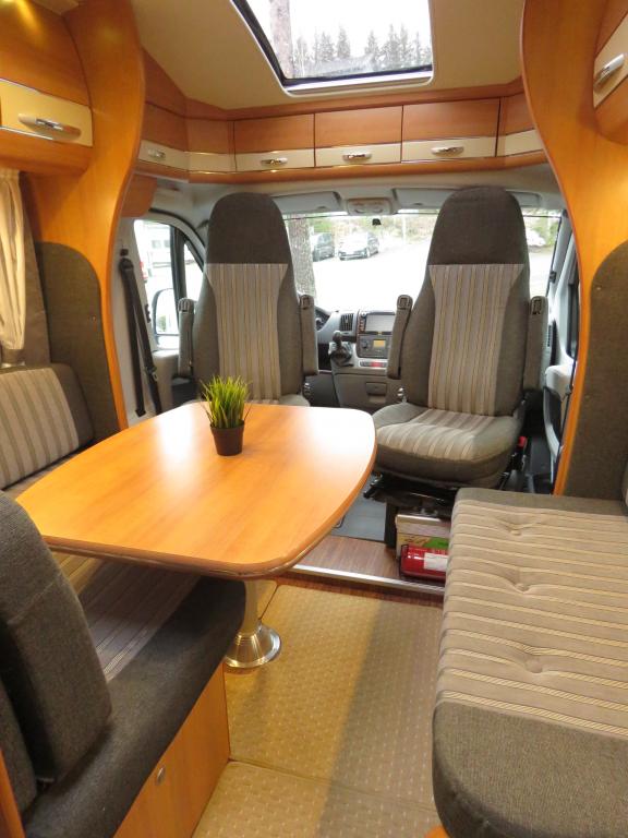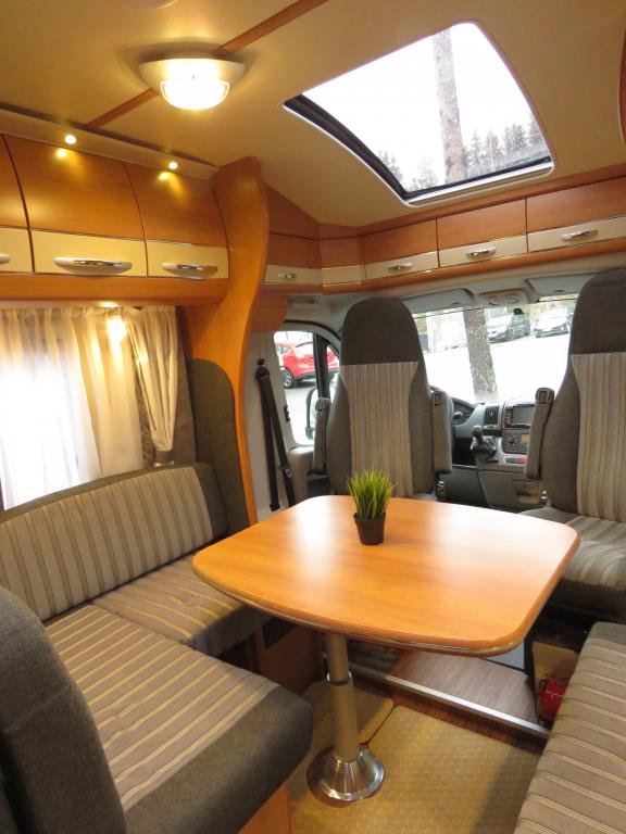 Auton takaosassa pitkittäinen parivuode ja pesuhuone, edessä valoisa pöytäryhmä molemminpuolisin sivusohvin. Toimivasta keittiöstä löytyy ison jääkaappi- pakastimen lisäksi kaasu- uuni.
