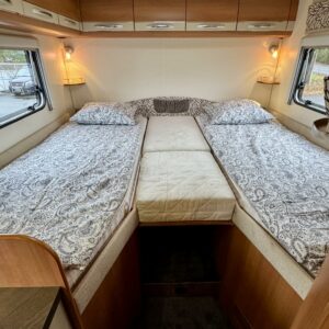 Peräpäästä löytyy muhkeat erillisvuoteet, joihin on helppoa kulkea. Vuoteet on mahdollista yhdistää koko auton levyiseksi megasängyksi. Vuoteiden alla on iso läpilastattava takatalli.