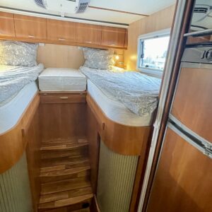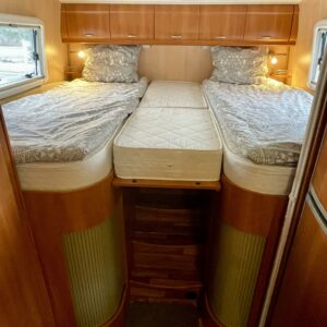 Auton takaosassa on pitkittäiset erillisvuoteet, jotka on lisäpatjan avulla mahdollista yhdistää koko auton levyiseksi parivuoteeksi. Vuoteiden alla on mukavan kokoinen takatalli.