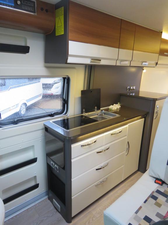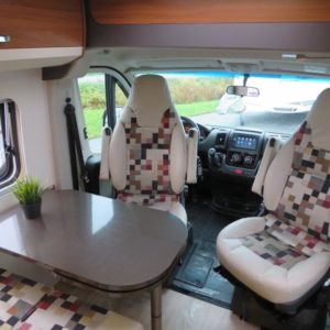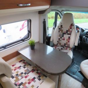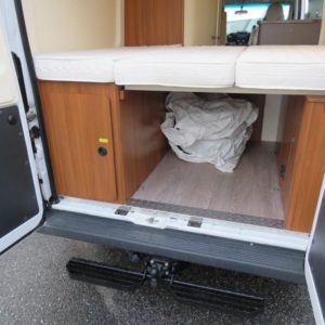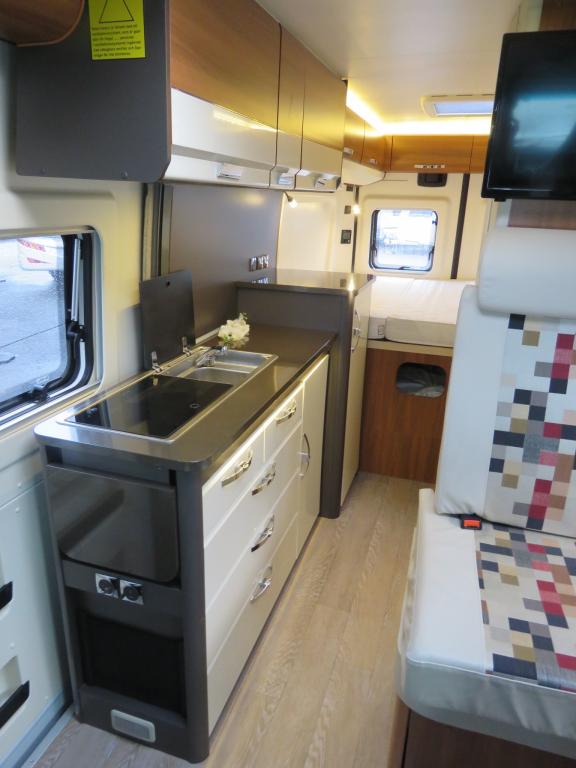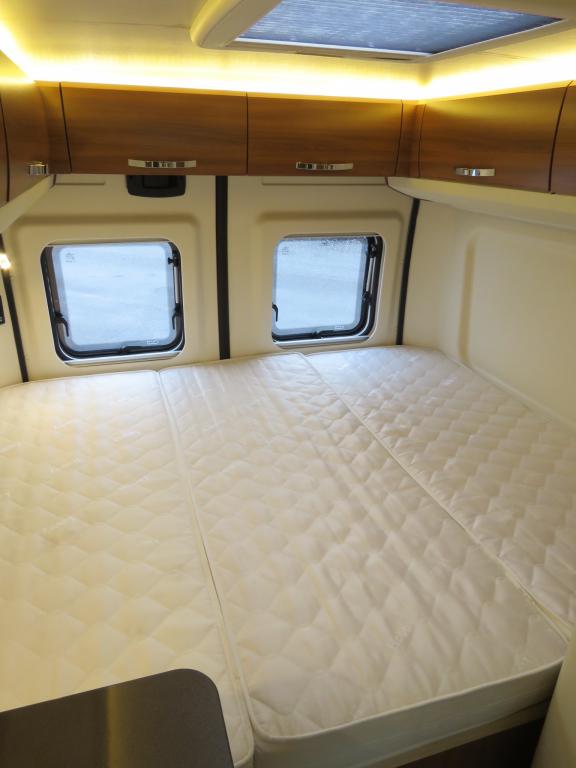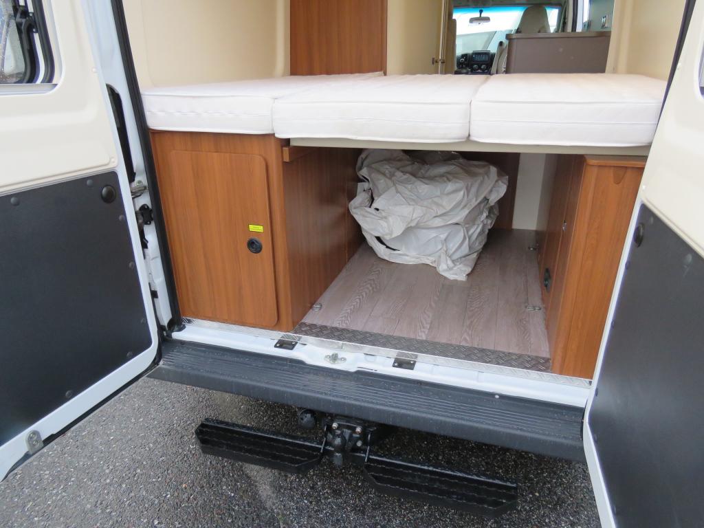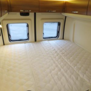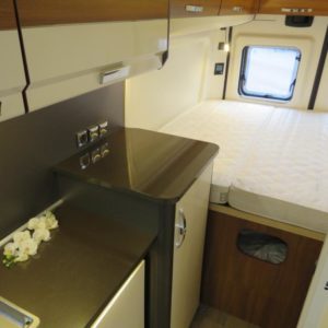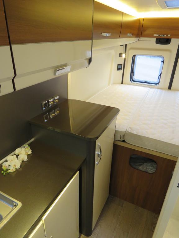 Suurella parivuoteella varustettu retkeilyauto. Edessä pöytäryhmä 4:lle. Keittiössä laskutilaa reilusti, jääkaappi ylhäällä. Leveä parivuode takana, jonka alla monikäyttöistä säilytystilaa.