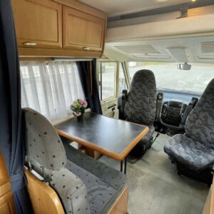 Auton etuosasta löytyy pöytäryhmä neljälle. Iso kattoikkuna tuo valoa koko autoon.