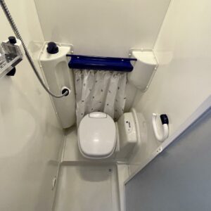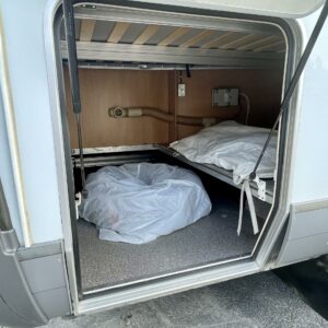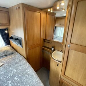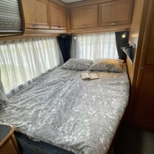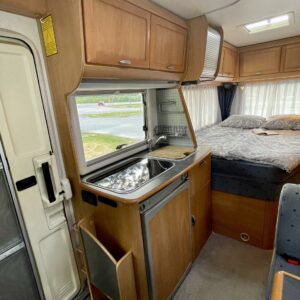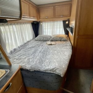 Auton takaosassa on pitkittäinen parivuode ja pesuhuone/ WC erillisellä ”eteisellä”.