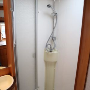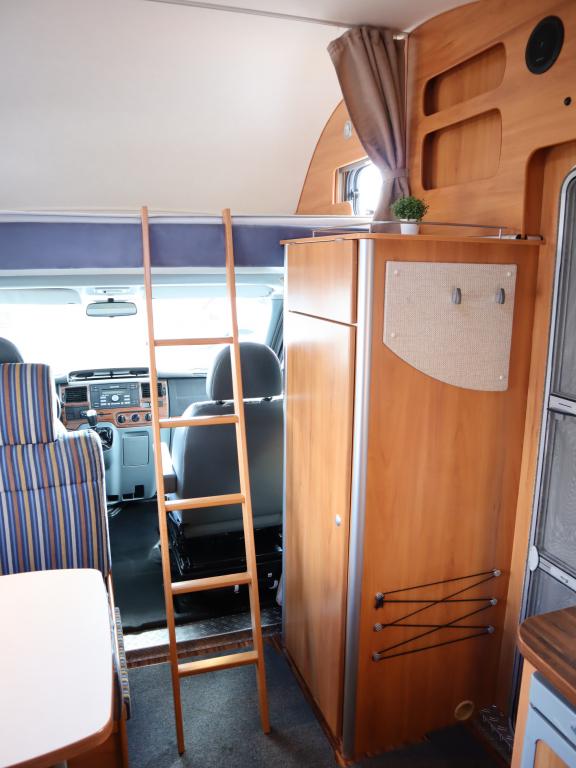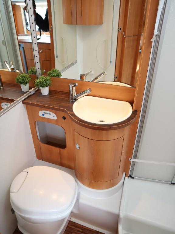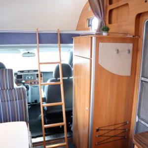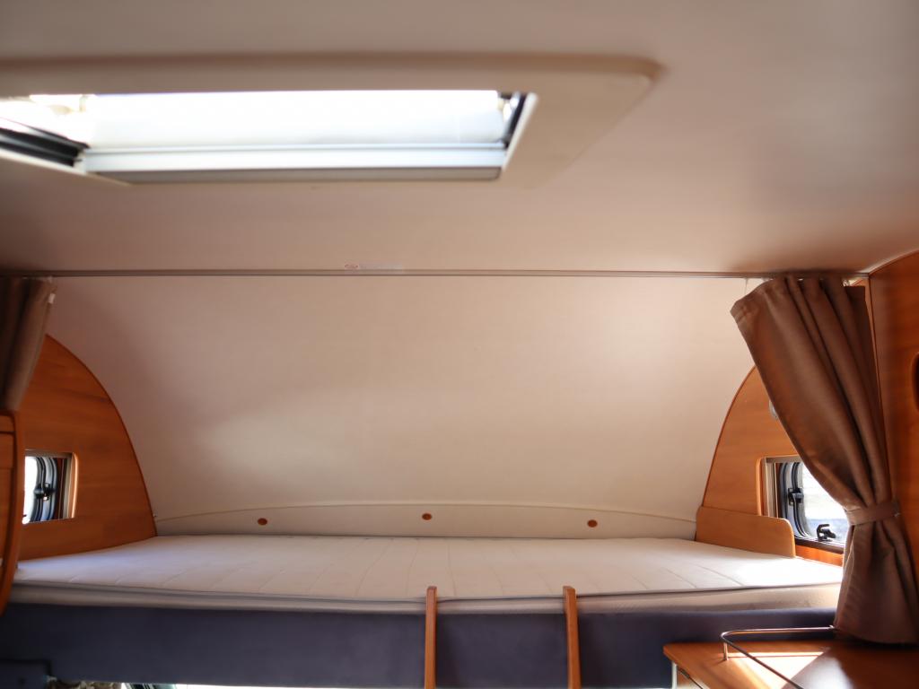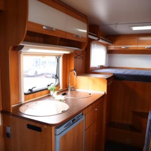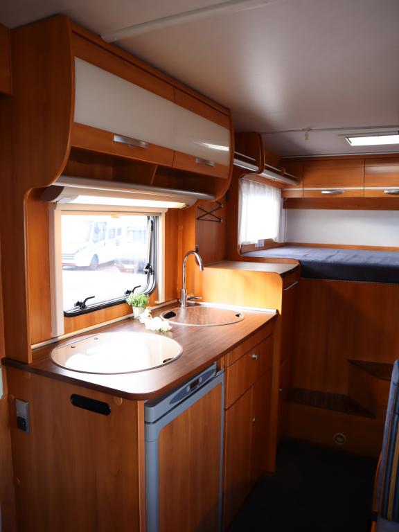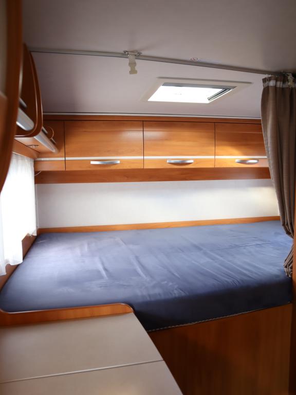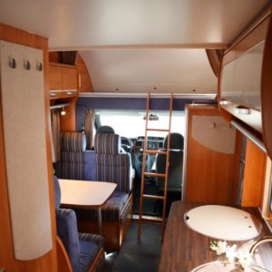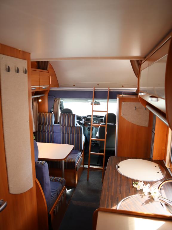 Takana parivuode vähän matalammalla + alla mukavan kokoinen talli, keskellä keittiö ja tilava pesuhuone, edessä istuinryhmä 4:lle josta parivuode, ohjaamon päällä alkovivuode.