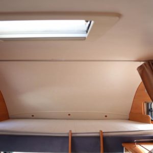 Takana parivuode vähän matalammalla + alla mukavan kokoinen talli, keskellä keittiö ja tilava pesuhuone, edessä istuinryhmä 4:lle josta parivuode, ohjaamon päällä alkovivuode.