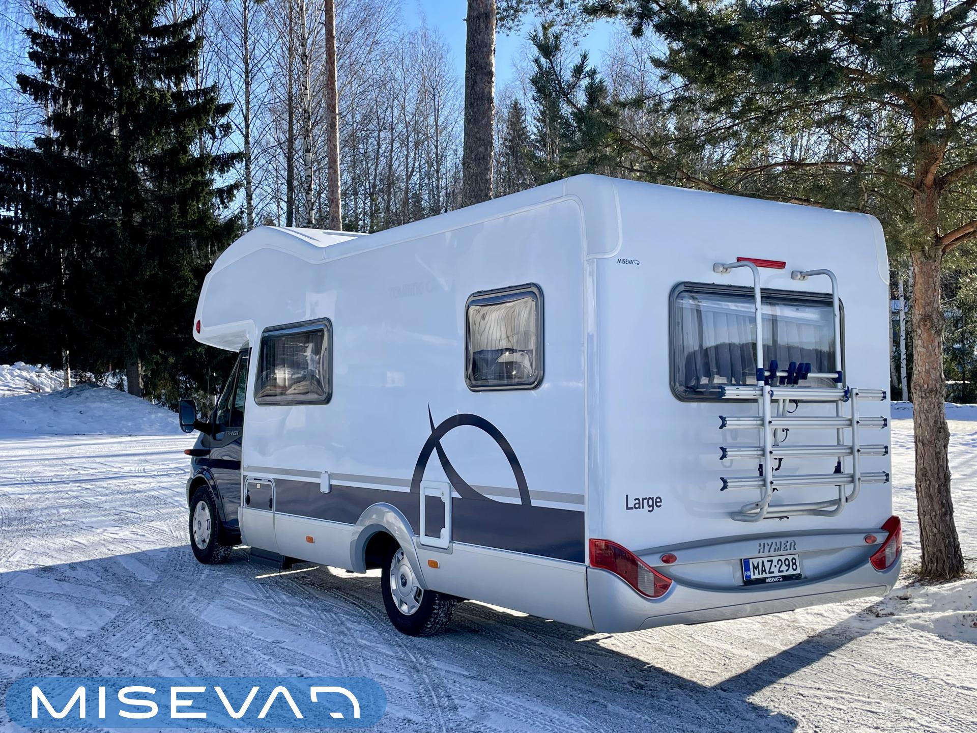 Runsaat tilat tarjoava alkovi Hymeri. Tämä on koostaan huolimatta B-kortilla ohjastettava auto, eli kokonaismassa rajoittuu 3500 kiloon. Auton takaosasta löytyy maukas U-ryhmä illanistujaisiin. Keskelle on asenmoitu keittiö, sekä WC/kylpuhuonetilat. Keittössä on mukavasti säilytys ja laskutilaa tavaroille. Kylppärissä on suihkulle oma tilansa. Etuosaa hallitsee vastakkain istuttava pöytäryhmä ja tästä saadaan sijattua tarvittaessa vuode kahdelle hengelle. Ohjaamon päällä on vielä alkovivuode minne saadaan majoitettua pari yöpyjää. Läämmitysjärjestelmänä Trumaticin ilmakeskuslämmitys sähkövastuksilla (sähköpatruuna) varustettuna.