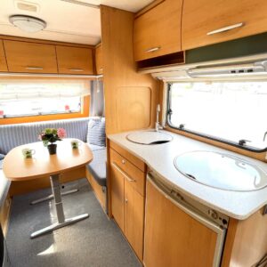 Vaunun takaosassa kerrosvuoteet, edessä U- ryhmä joka sijattavissa parivuoteeksi. Keittiö ja pesuhuone/ WC vaunun keskivaiheilla.
