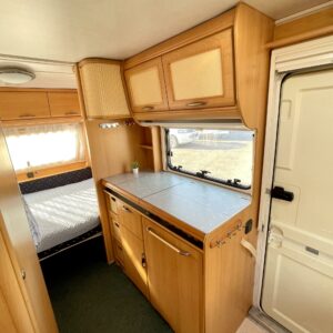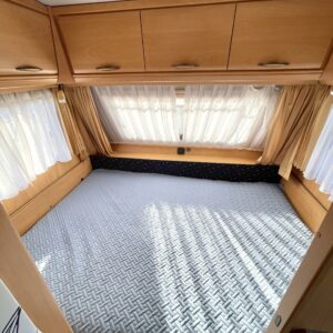 Siisti ja kevyt parivuoteinen laatuvaunu edullisesti. Edessä oleva vuode muutettavissa myös pöydäksi.
