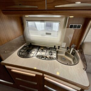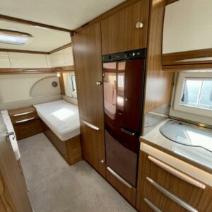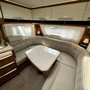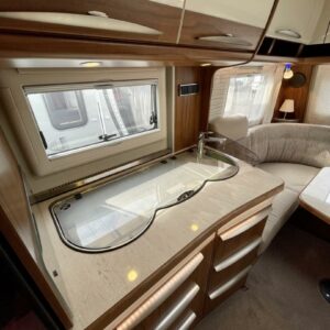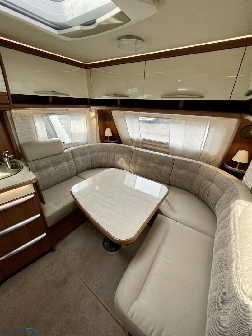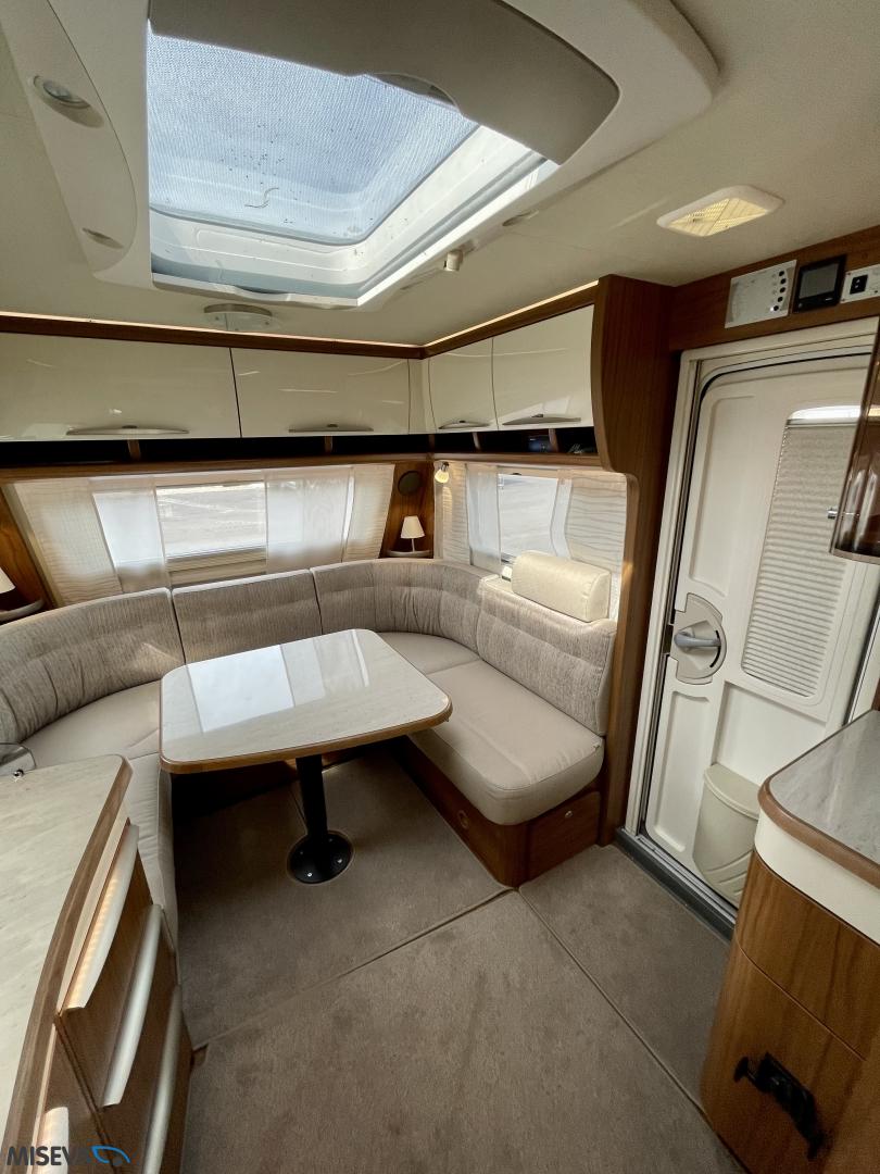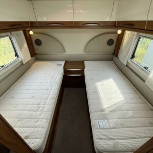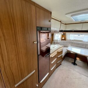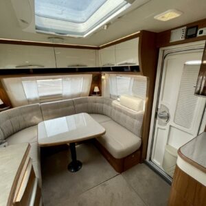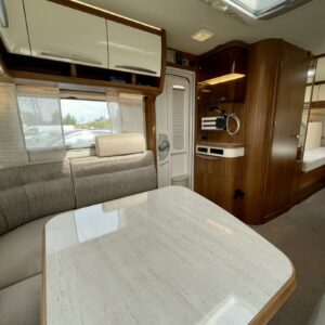 Pohjaratkaisuna aisanpäässä U-mallinen istuinryhmä, josta pedattavissa parivuode. Takapäässä erillisvuoteet, keskellä normaali keittiövarustus sekä WC-tila.