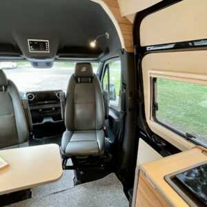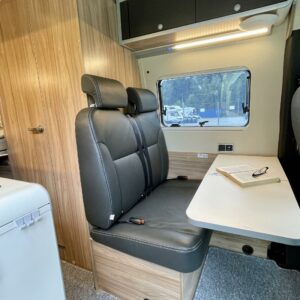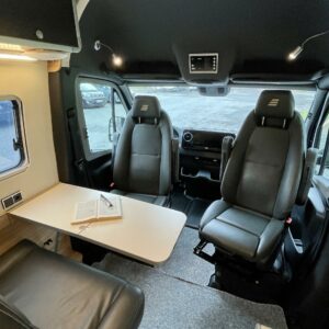 Auton etuosasta löytyy viihtyisä pöytäryhmä neljälle. Vaaleiden kalusteiden ja tumman nahkasisustan luoma kokonaisuus tuo tilaan hillittyä arvokkuutta.
