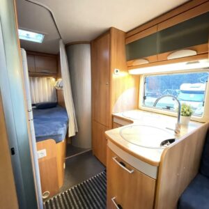 Pitkittäinen parivuode takana. Vieressä wc tila erillisellä suihkulla. Keskellä L-keittiö tilavalla jääkaapilla. Edessä pöytäryhmä sekä alaslaskettava parivuode ohjaamon päällä.