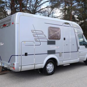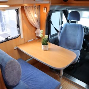 Mukavat tilat alle kuuteen metriin. Edessä istuinryhmä neljälle. Keskellä keittiö ja WC sekä suihku. Takana parivuode jonka alla suuri tavaratila.