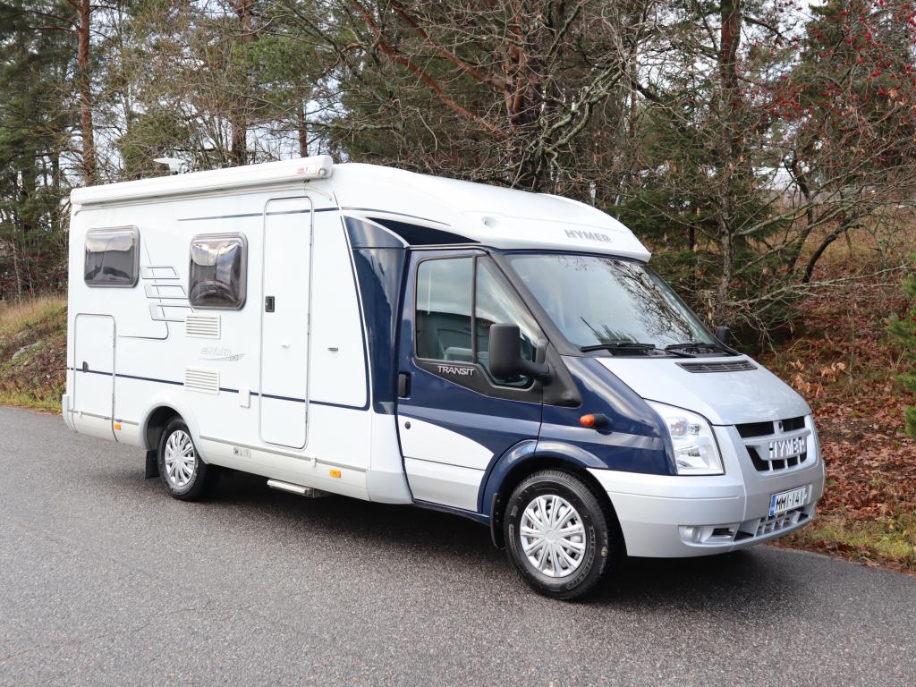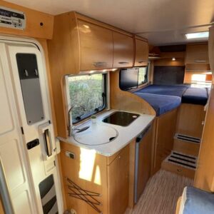 Takana erillisvuoteet ja alla iso tavaratila, keskellä pesuhuone ja keittiö,edessä istuinryhmä 4:lle kääntyvin ohjaamon penkein.
