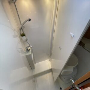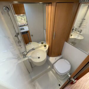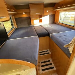 Takana erillisvuoteet ja alla iso tavaratila, keskellä pesuhuone ja keittiö,edessä istuinryhmä 4:lle kääntyvin ohjaamon penkein.