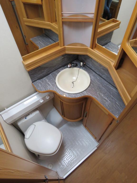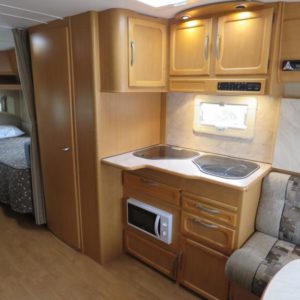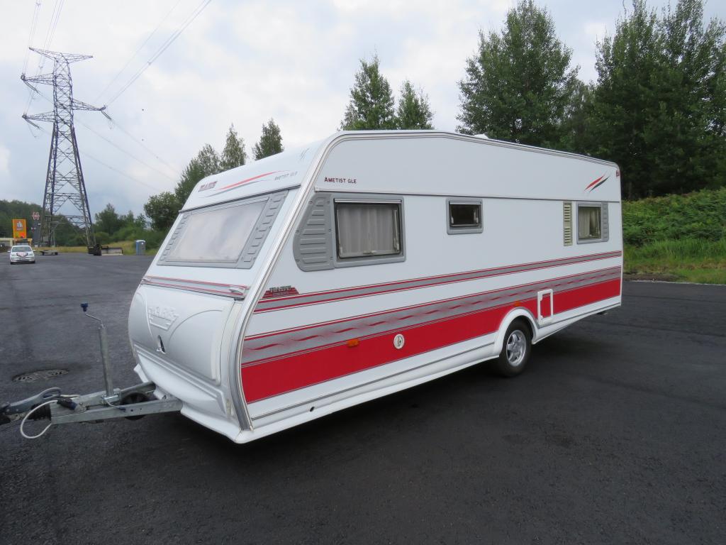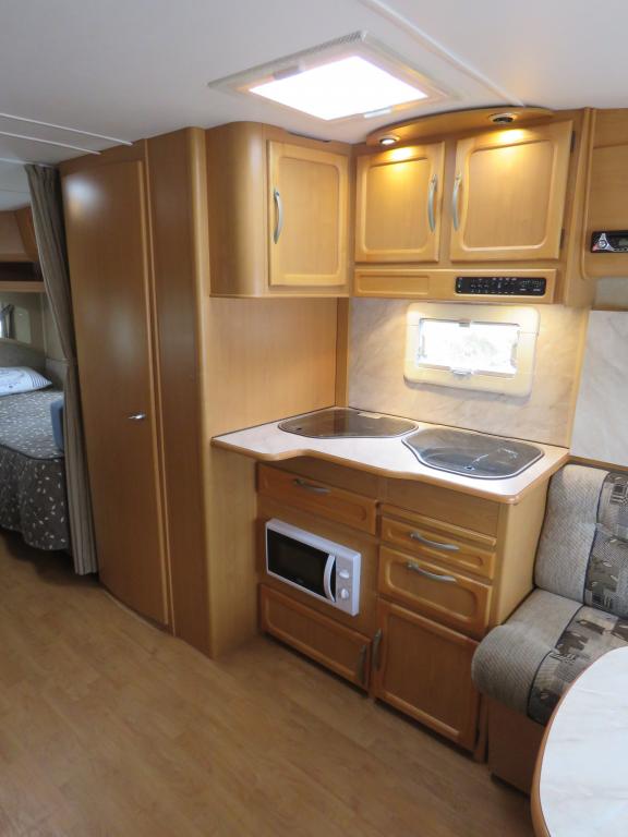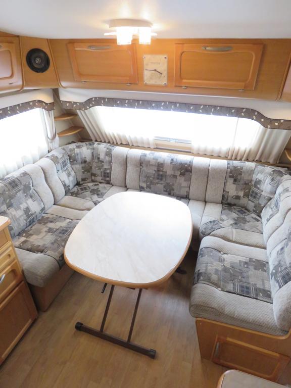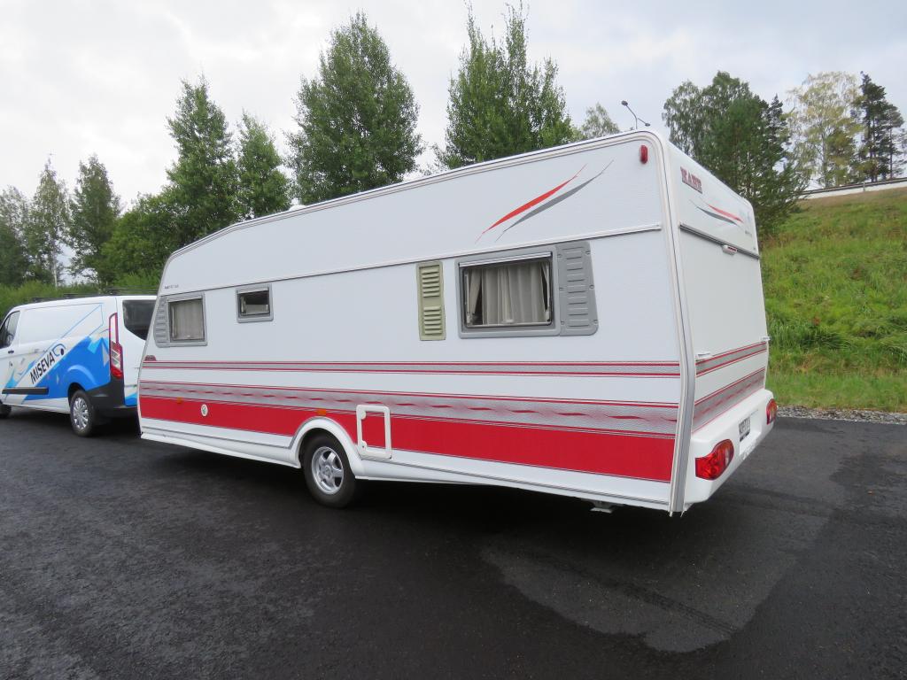 Varusteina mm. Tehokas Alde -nestekeskuslämmitys sähköpatruunalla ja nestekiertoisella lattialämmityksellä, Kotelomarkiisi, Kaasupullonvaihtaja, Mikroaaltouuni..