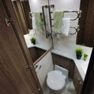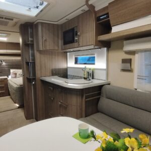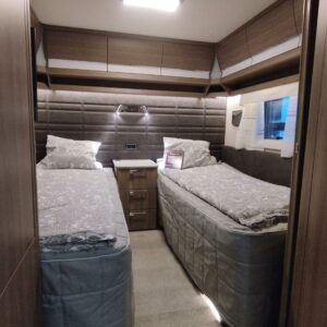 Edessä tilava U-ryhmä mistä saa sijattua tarvittaessa vuoteen kahdelle henkilölle. Keskellä keittiö isolla jääkaapilla ja mikroaaltouunilla höystettynä. Keittiön jatkona viihtyisät WC/kylpyhuonetilat. Toisella puolella keskellä säilytystiloja. Takana pitkittäiset erillisvuoteet.