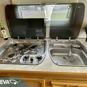 Vaunun takaosassa pitkittäinen parivuode ja pesuhuone/ WC, edessä viihtyisä U- ryhmä joka sijattavissa toiseksi parivuoteeksi.