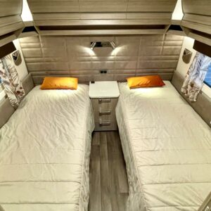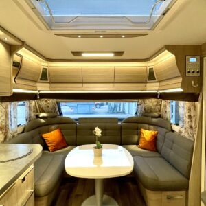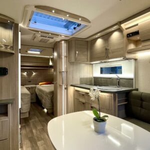 Vaativaan ympärivuotiseen käyttöön tehty ruotsalainen Kabe kysytyllä erillisvuodepohjalla! Vaunun etuosassa on huippumukava U-pöytäryhmä, jossa kelpaa lekotella televisiota katsellen talven pakkasia tai kesän helteitä karussa. Vaunun keskiosan varustellusta keittiöstä löytyy runsaiden kaappitilojen lisäksi liesituuletin, kompakti kolmiliekkinen liesi, mikroaaltouuni sekä korkea jääkaappi erillisellä pakastelokerolla. Kylpyhuone sijaitsee keittiön vieressä, joten vaunun takaosaan jää hyvä tila kahdelle täysikokoiselle sähkösäätöiselle erillisvuoteelle. Koko komeus on valaistu kauniilla epäsuoralla LED-valaistuksella ja kruunattu nestekiertoisen lattialämmityksen ja ilmastointilaitteen kaltaisilla mukavuuksilla. Tervetuloa ihastumaan!