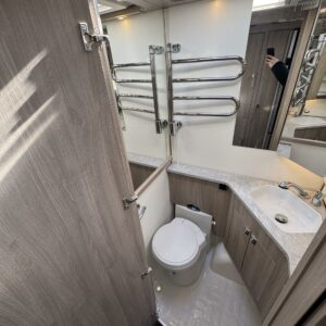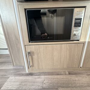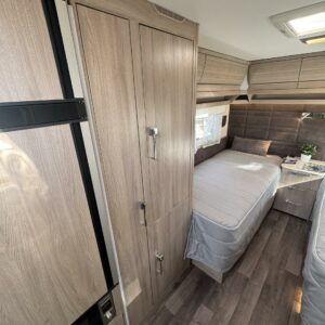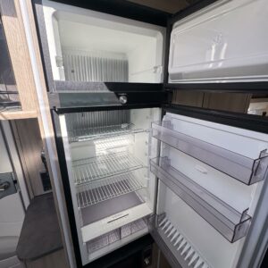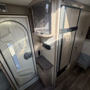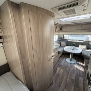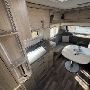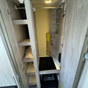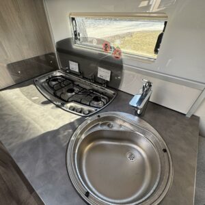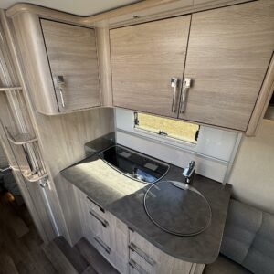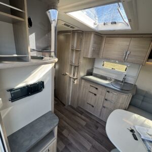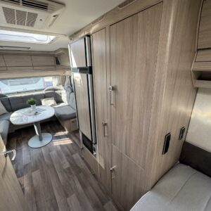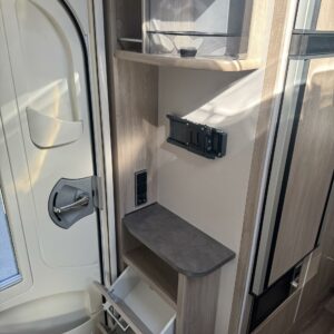 Vaunun keskivaiheilla on keittiösaareke, iso jääkaappi- pakastin ja runsaasti säilytystilaa korkean jääkaapin muodossa. Keittiön varustusta täydentää mikroaaltouuni ja liesituuletin.