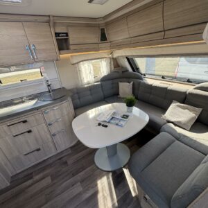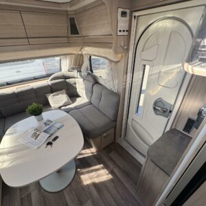 Vaunun etuosassa on viihtyisä U- ryhmä, jonka ympärille mahtuu isompikin seurue iltaa istumaan. Pöytäryhmästä saa tarvittaessa sijattua lisävuoteen.