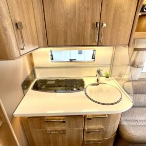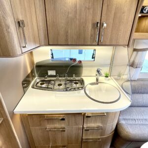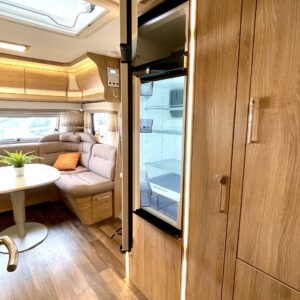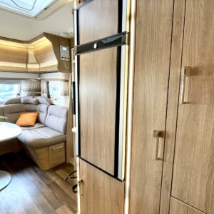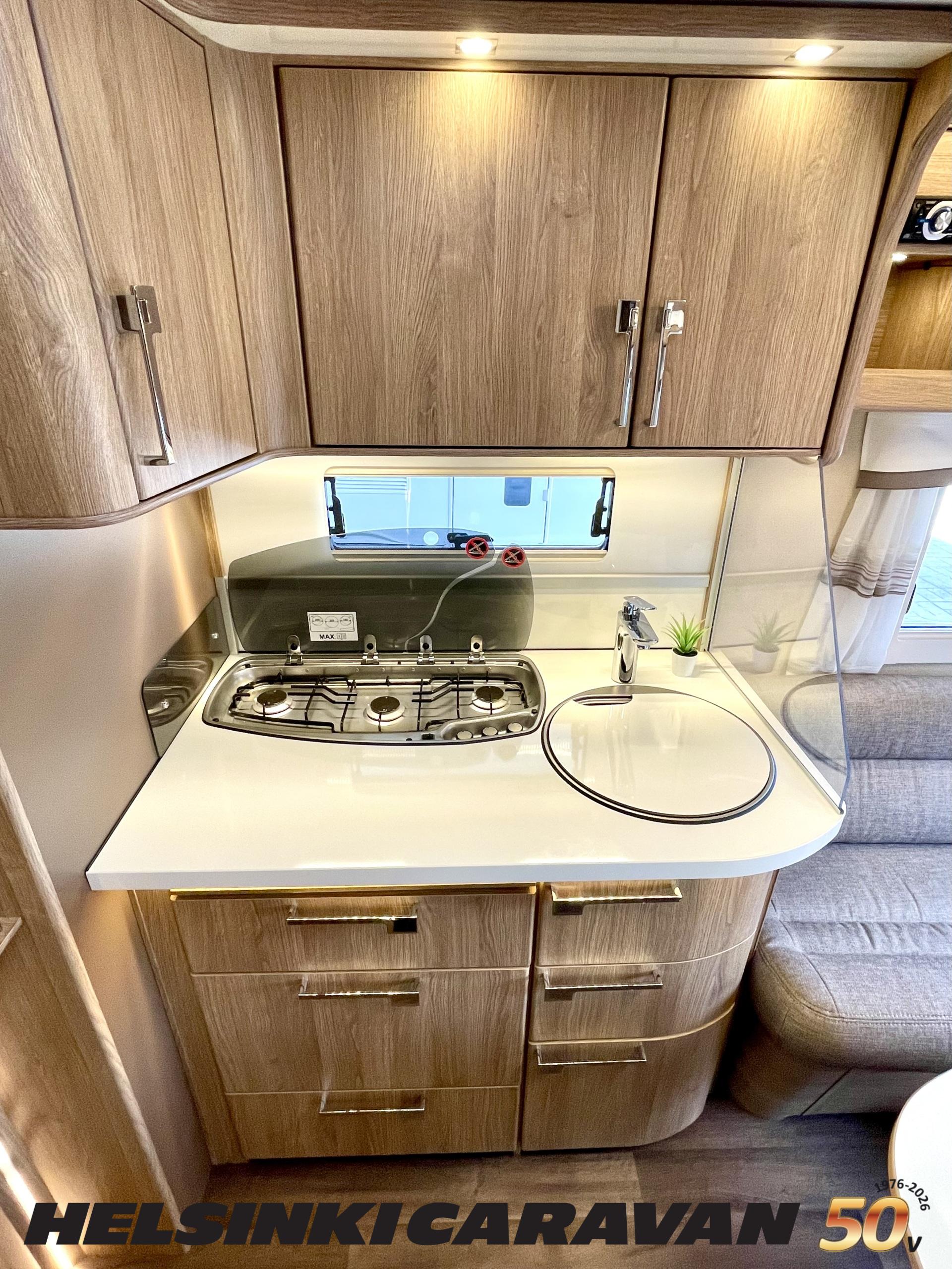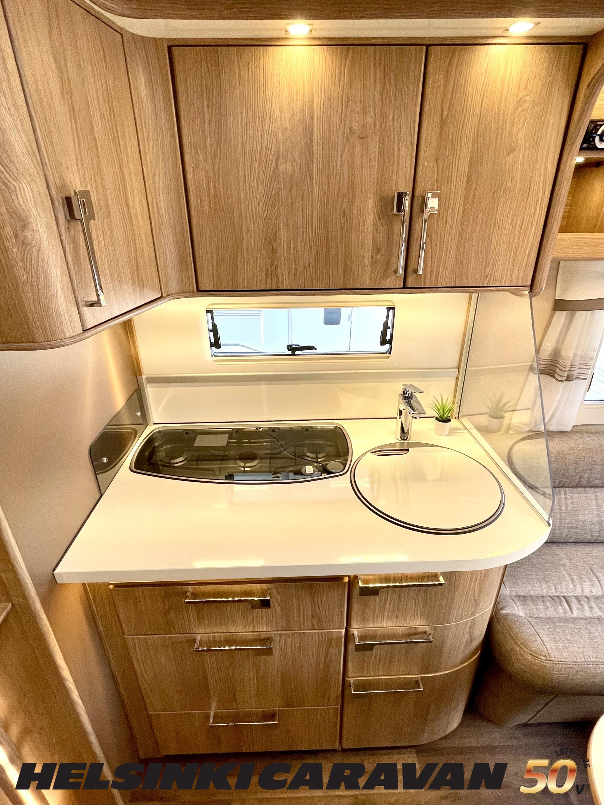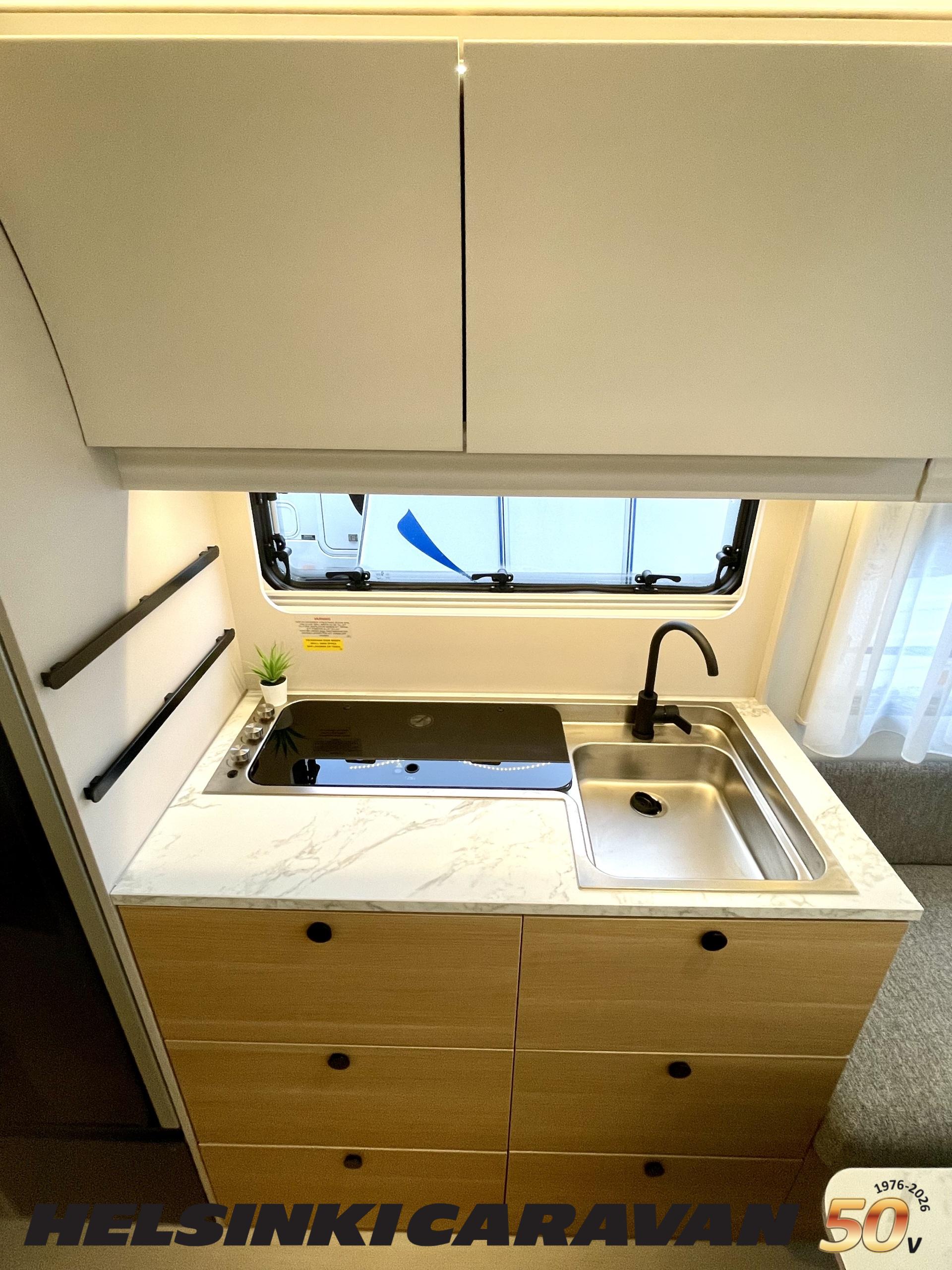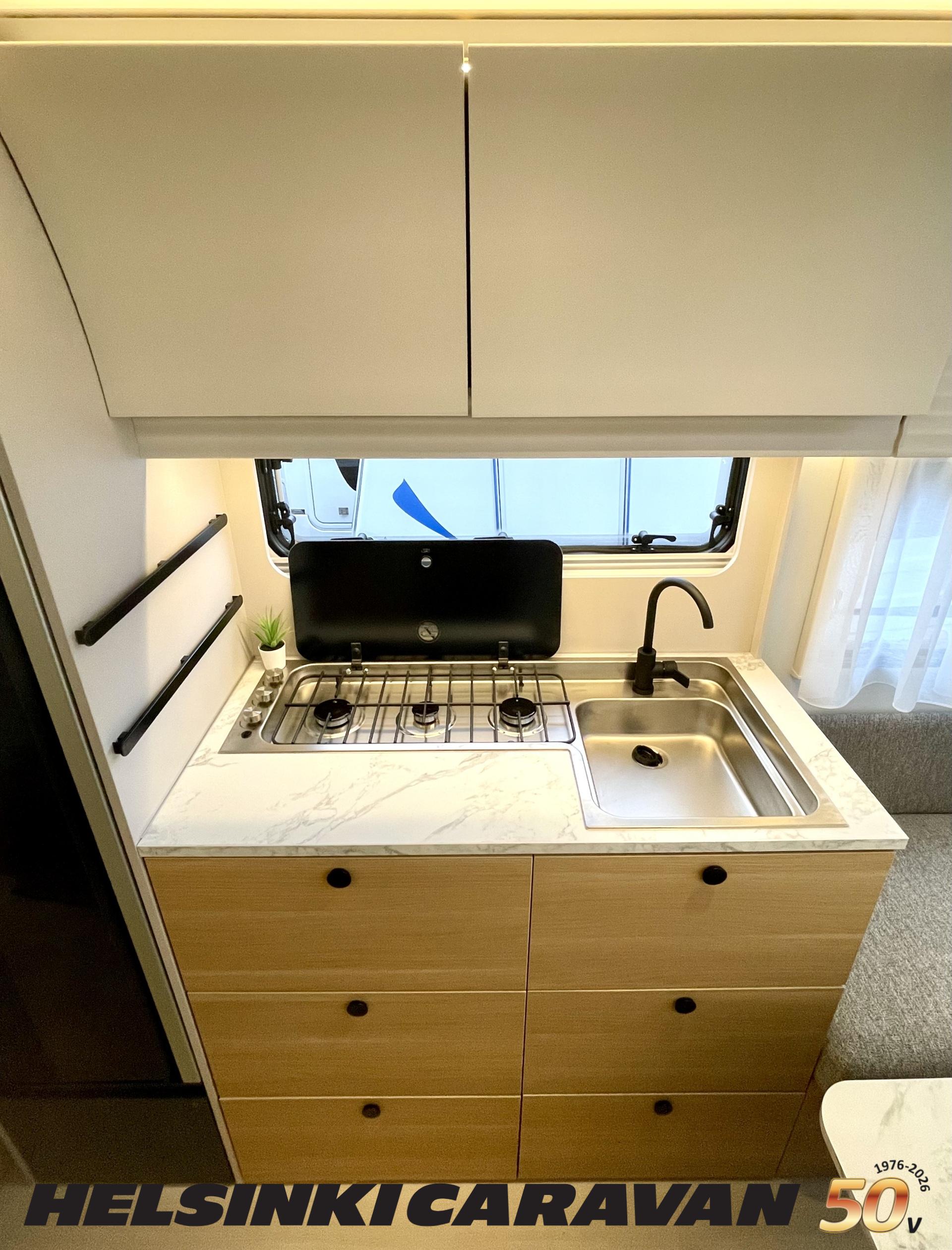 Keskikeittiön varustukseen kuuluu mm. kaasuliesi kolmella polttimella, liesituuletin, lavuaari ja reilusti lasku- ja kaappitilaa. Toisella seinällä sijaitseva Dometicin kolmitoimijääkaappi erillisellä pakastinosalla aukeaa näppärästi molempiin suuntiin tehden napostelusta ehkä vähän liiankin helppoa.